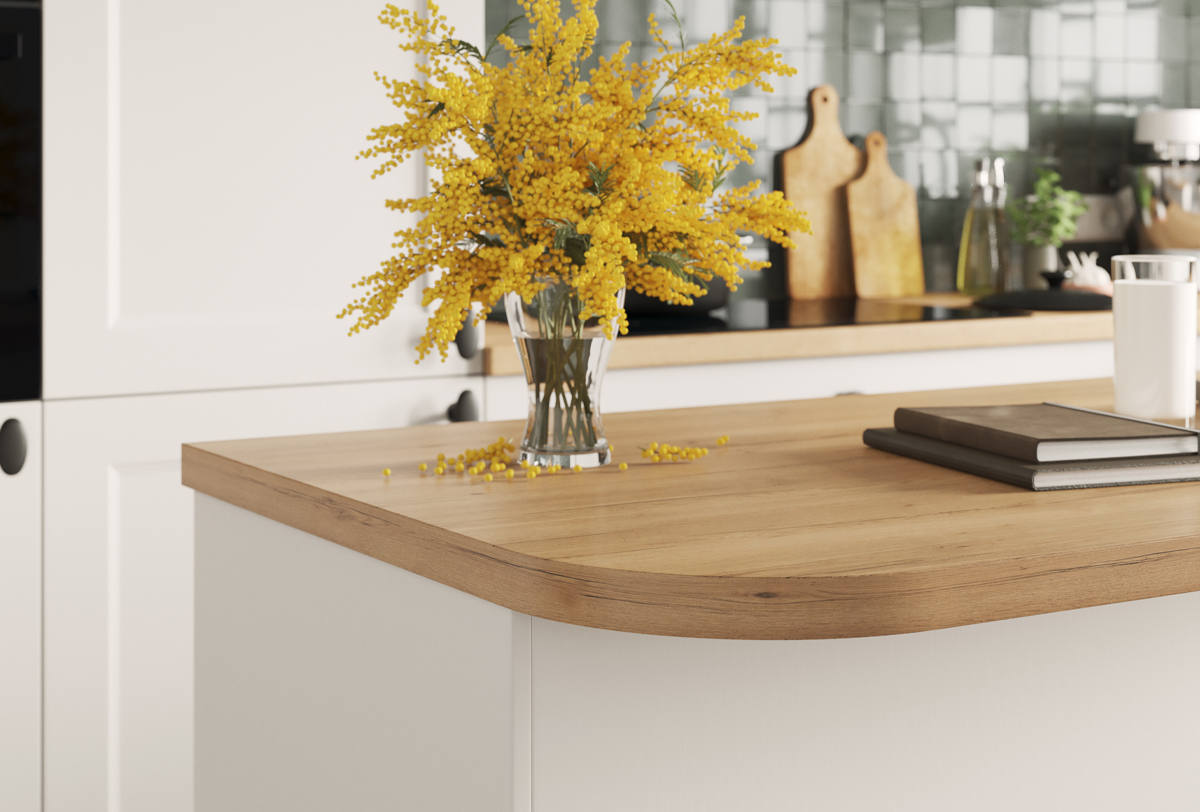 ¡Las familias con niños pequeños apreciarán el detalle de las esquinas redondeadas de la isla que seguro que les evitará más de un chichón! Pero como que sea práctica no significa tener que renunciar a la estética, la isla también aporta un toque muy estiloso y elegante a la cocina!