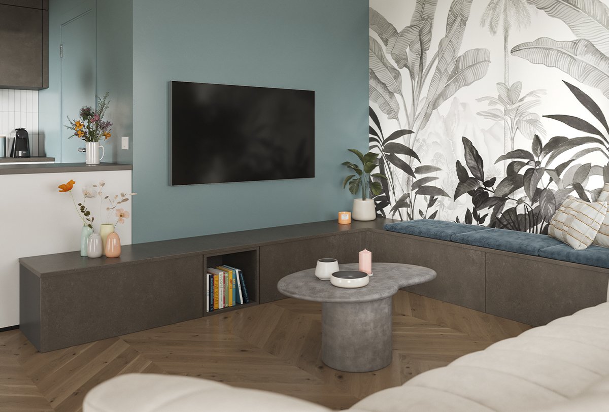Dando continuidad a la cocina, el mueble para la TV se prolonga en un banco integrado con más espacio para sentarse. Ideal para cuando tienes invitados y crear un espacio abierto.