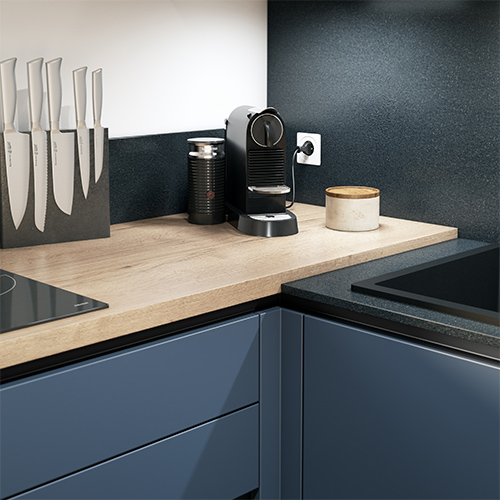 La cocina Velvet destaca por su diseño en L. Es minimalista, pero también refinada. Con todos los electrodomésticos necesarios – frigorífico, horno, lavavajillas, extractor y placa de cocción – ofrece una solución completa y sofisticada. Las líneas depuradas y los cuidados acabados de sus muebles ponen EL toque de diseño a tu casa.