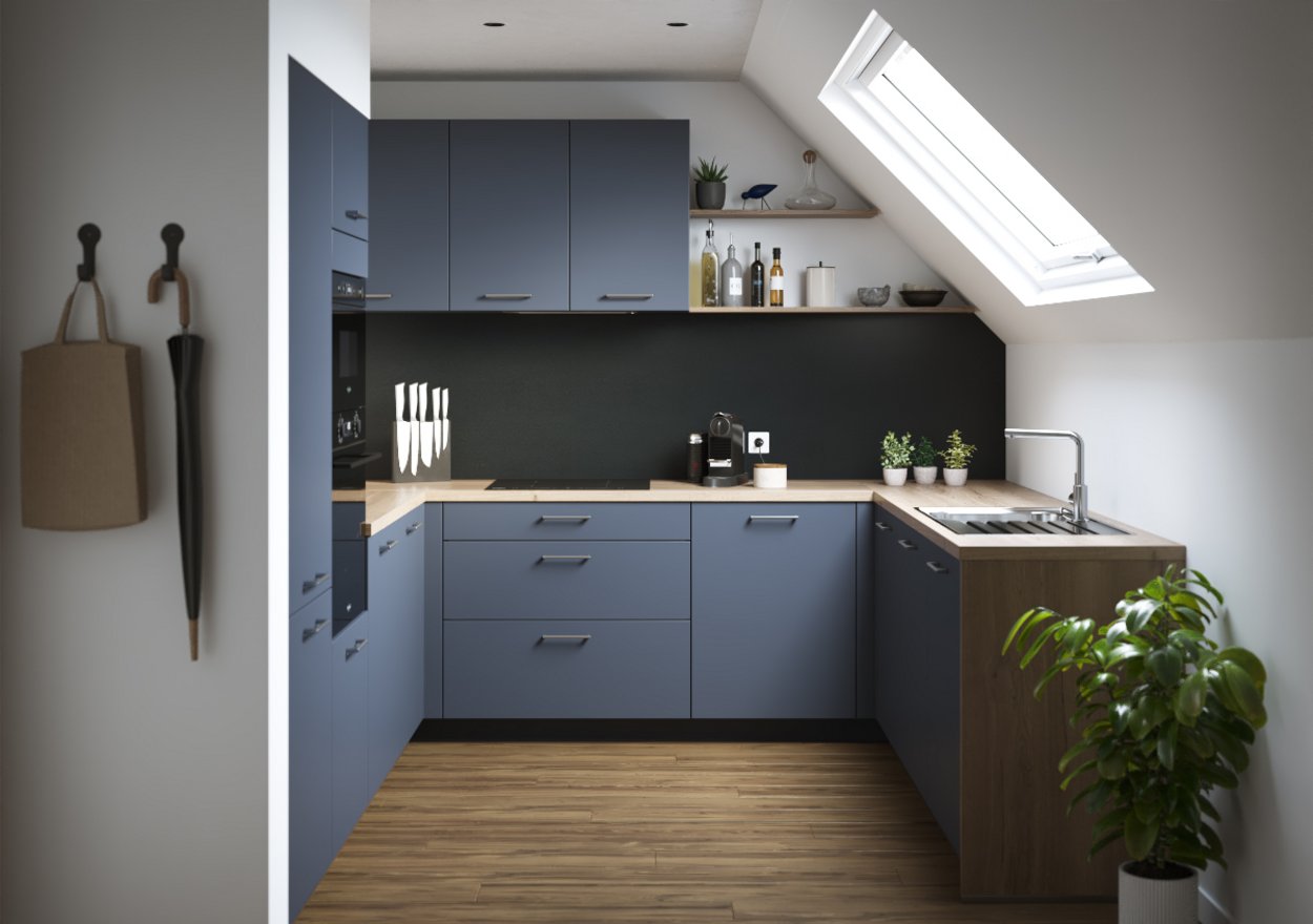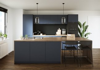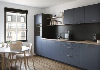 The Velvet is distinguished by its L-shaped design, combining minimalism and refinement. Equipped with all the appliances you need - fridge, oven, dishwasher, hood and hob - it offers a complete, sophisticated solution. The clean lines and meticulous finishes of its furniture make this kitchen THE decorative touch of choice for your home.