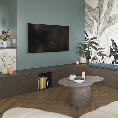 In continuity with the kitchen, the TV unit extends seamlessly into an integrated bench, providing additional seating. Perfect for entertaining guests and creating an open space.